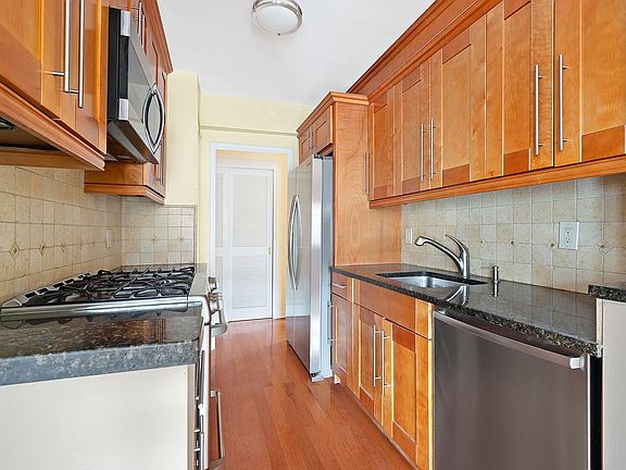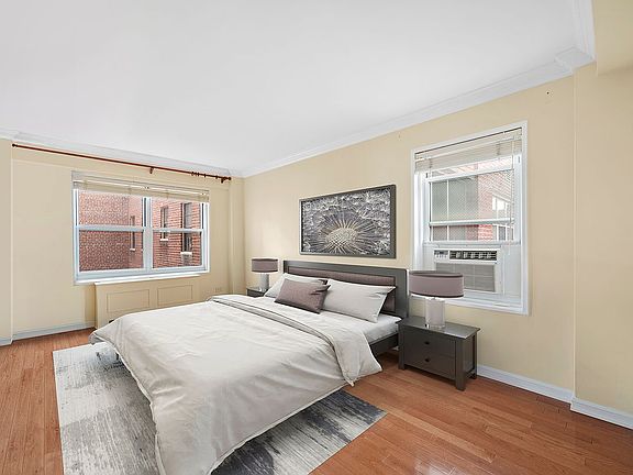 The kitchen is tastefully outfitted with premium stainless steel appliances, including a Samsung French door refrigerator, a 5-burner range, a Bosch dishwasher, and a Frigidaire microwave. The granite countertops, deep sink, stylish tilework, and custom cabinetry provide abundant space for all of your culinary needs. The huge primary bedroom, with three windows and two exposures, features an en suite bathroom, two closets including a walk-in closet, and provides more than enough room for a king-sized bed, a sitting area and a home office. The second spacious bedroom also offers three windows and two exposures, a generous closet, and fits a king-sized bed with room to spare for additional furniture placement. A sleek windowed bathroom with tub and shower is next to this bedroom.