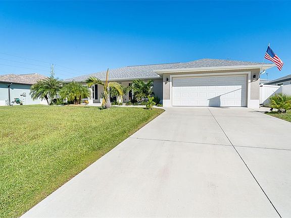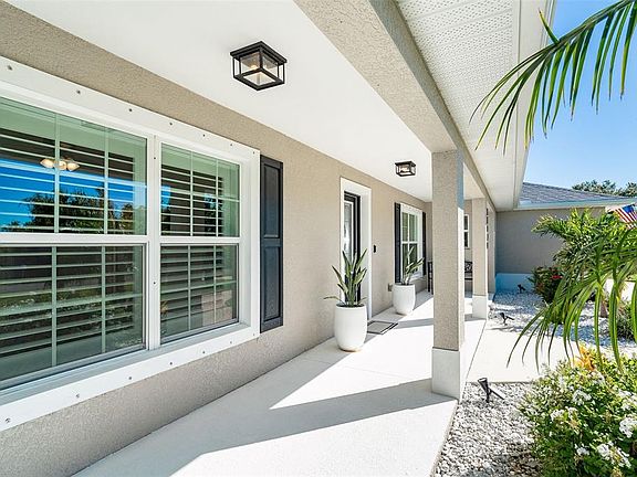 Newly constructed in 2020, this meticulously maintained, one-owner home, offers all the Florida home comforts you've been dreaming of! The open floor plan assures you a light and bright home, as well as the high-end finishes will dazzle you with luxury living at its best! The PGT impact-rated windows and slider, provides energy efficiency, and security, not to mention hurricane shutters for extra added storm protection, and located in the highly sought after X Flood Zone. Once you enter this lushly landscaped and fenced home, the enjoyment of Florida living begins with beautiful porcelain, wood look plank flooring throughout, and a cathedral ceiling in the spacious living room. This 3 bedroom, 2 bathroom, pool home, is move-in ready, and waiting for you and your family to start making lifetime memories. A split floorplan provides you, your family, and guests the privacy they deserve. The spacious master suite is complete with a large walk-in closet, ensuite bathroom and stylish tray ceiling. The standout kitchen is a chef's delight and features granite countertops, shaker style wood, soft close cupboards and drawers, stainless steel appliances, 6 ft. breakfast bar, recessed lighting and a pantry closet. Guest bedrooms are spacious, each with a large built-in closet. Serving as a convenient direct access to the pool area, is the guest bathroom, which is just perfect for outdoor entertaining! An interior laundry room, with its many upgrades will surely not disappoint. Enjoy true Florida outdoor living with a paver deck and sprawling screened-in pool area, featuring a 12’ x 23’ Pebble tec heated pool, roll down sun shades, pool shed, and a large paver deck outside the screened lanai for grilling and entertaining! Your private fenced yard, complete with solar powered evening lighting, will be the outdoor oasis you'll retreat to after a day at the beach or a round of golf. This home's location is surrounded by many of the finest golf courses, not to mention world class fishing, easy access to beaches, shopping, and casual evening dining and entertainment. You need to act quickly, as this home won't last long. Make this home your next "Home Sweet Home" and schedule your appt. today! Home furnishings are available under separate contract.