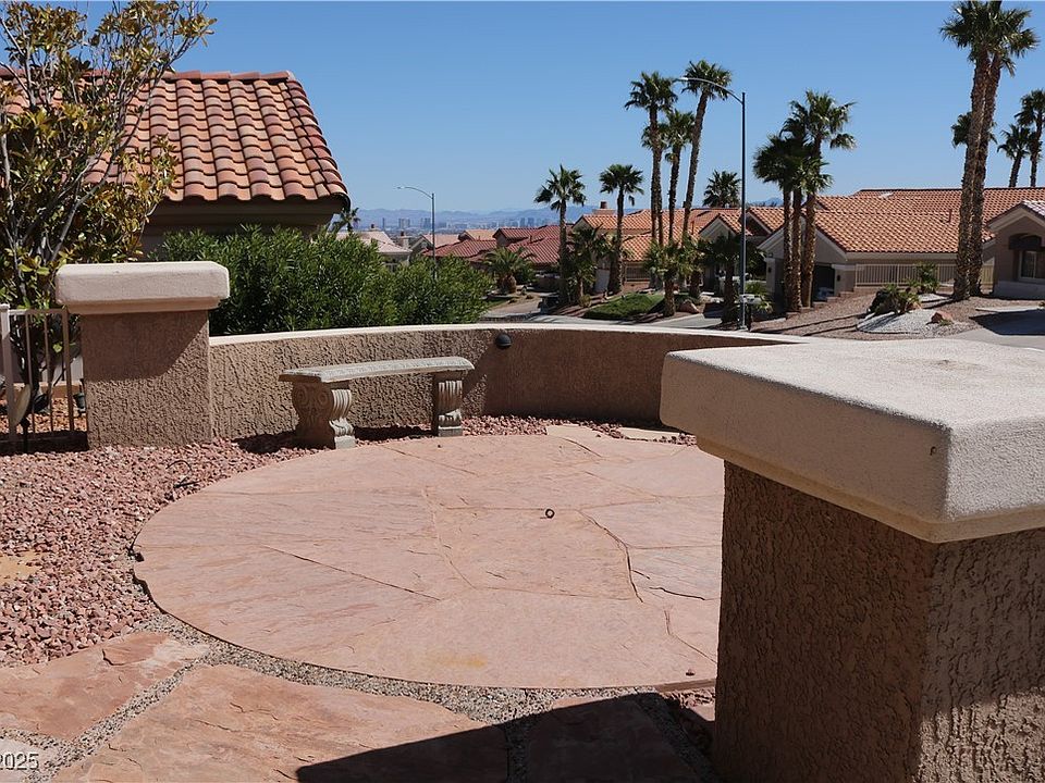 PAID-OFF SOLAR!! Incredible Strip and Mountain Views! Enjoy the best of Las Vegas living with this beautifully upgraded Tahoe model, featuring stunning Strip views from the courtyard and peaceful mountain views from the backyard. This home is move-in ready with fresh interior paint, brand new water heater, brand new toilets, and new HVAC system installed in 2022. Step inside to find 20” tile and laminate flooring throughout, crown molding, and updated kitchen with granite countertops, cherry cabinets with soft-close hinges, pull-out shelves, stainless steel appliances, and a double oven gas stove. Both bathrooms have been upgraded with granite counters and brushed nickel hardware, adding a modern, polished touch. The epoxy-coated garage floor comes complete with deluxe storage cabinets and overhead storage racks. Outdoor accent lighting, newer and well-maintained systems, and a serene backyard oasis perfect for relaxing or entertaining with your CharBroil Barbecue.