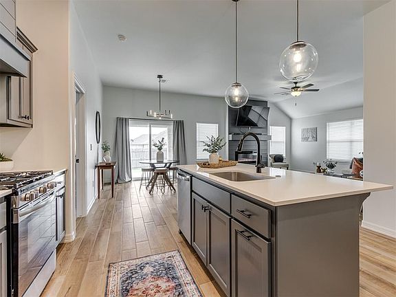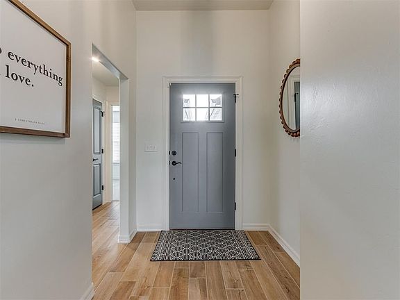 Welcome to this gorgeous, well-crafted home completed in 2024, located in a beautiful neighborhood. This 3-bedroom, 2-bath home offers modern design and comfort, featuring builder upgrades and timeless style throughout. The open-concept layout offers great flow and generous living spaces, including a large living room with a sleek modern electric fireplace, wood-look tile in the main areas in a perfect wood tone that brings warmth to any modern space, soft carpet in the bedrooms, and modern yet timeless ceramic tile in the bathrooms. A covered back patio provides the perfect spot to enjoy your morning coffee. Designed to impress, the kitchen features a center island perfect for food prep and casual dining, with seating for 2 to 4 depending on stool size; custom maple cabinetry painted a sleek dark gray; quartz countertops; a timeless marble backsplash; stainless steel appliances; a direct vent hood over the gas range; elegant designer lighting; and a generous pantry. The laundry room, conveniently located off the kitchen, features a stylish wood folding table and built-in storage. Retreat to the primary suite, offering a large bedroom, double vanity, frameless glass shower with marble tile, relaxing garden tub, and a spacious walk-in closet. Spacious secondary bedrooms are equally comfortable, and there is easy access to a beautifully appointed hall bath featuring a fully tiled tub surround with a stunning herringbone design. Additional highlights include 2" faux wood blinds, a tankless water heater, a fully fenced backyard with plenty of room to play or garden, and a spacious 3-car garage. Conveniently located near shopping, restaurants, the highway, and the turnpike! Mustang Schools! Schedule your private tour today!