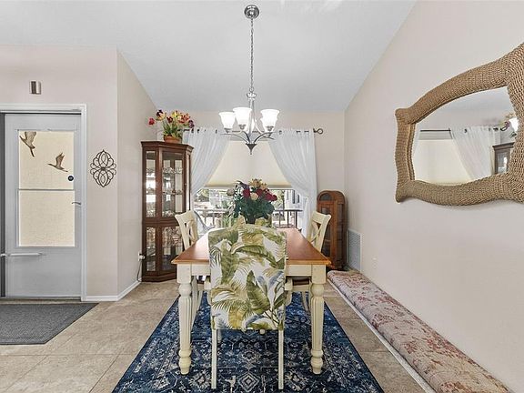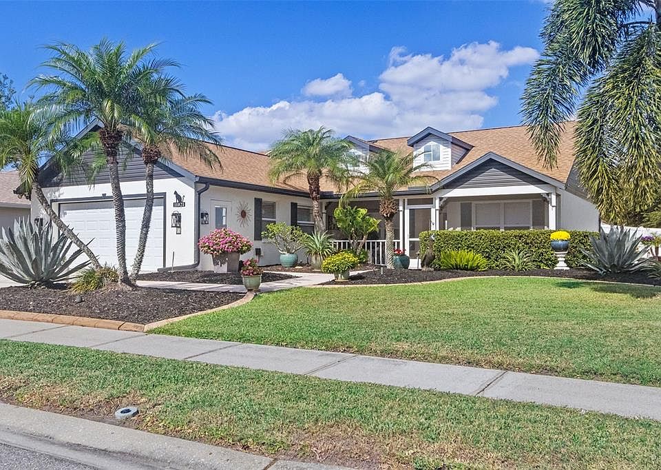 Rare opportunity in the highly sought-after Gates Creek community! This charming, low-maintenance corner-lot rancher (former model home) offers 3 beds, 2 baths, paid-off solar panels, and an ultra-low HOA. Prime location surrounded by multimillion-dollar commercial developments, new shopping plazas (including the brand-new Costco), top restaurants, multiple golf courses, and excellent schools-all just 2 miles from I-75. Light-filled open split plan with vaulted ceilings, ceramic tile throughout, quartz kitchen counters, stainless appliances, oversized 2-car garage with built-ins, and indoor laundry. Step outside to your private screened pool (34.5-ft lap-style with fountain, solar + electric heat), covered entertaining lanai, irrigated landscaping, fresh exterior paint/siding (2.5 yrs old), and fully screened front porch for outstanding curb appeal. Move-in ready, impeccably maintained, and truly turnkey-don't miss this!