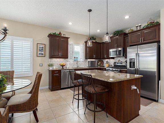 New Price, Same Gorgeous Home! Step into the perfect mix of elegance and comfort in this beautifully maintained 3-bedroom, 2-bathroom home with a flexible office/den space. The heart of the home is a chef’s dream—featuring rich dark wood cabinetry, a stylish backsplash, eye-catching granite countertops, stainless steel appliances, a roomy walk-in pantry, and pendant lights over the breakfast bar for that extra pop. The open-concept living and dining area shines with coffered ceilings, plantation shutters, and modern lighting, creating a space that’s both welcoming and upscale. The spacious primary suite offers a spa-like retreat with dual sinks and a sleek walk-in shower. Enjoy thoughtful touches throughout—custom hurricane shutters, a retractable screen front door, rain gutters, a utility sink in the laundry room, and plush carpet in the bedrooms. The garage even has a built-in workbench—ideal for projects or staying organized. Step outside to your extended lanai, perfect for relaxing, entertaining, or even a cozy outdoor movie night. Set in a scenic community framed by Florida Live Oaks, you’ll have access to resort-style amenities: a sparkling pool and spa, fitness center, ballpark, pavilion, dog park, nature trails, boardwalk, basketball court, and picnic areas with grills. Minutes from the Gulf beaches, top schools, great dining, shopping, and medical care—this home has it all. Luxury, location, and laid-back Florida charm—this is the one to see!