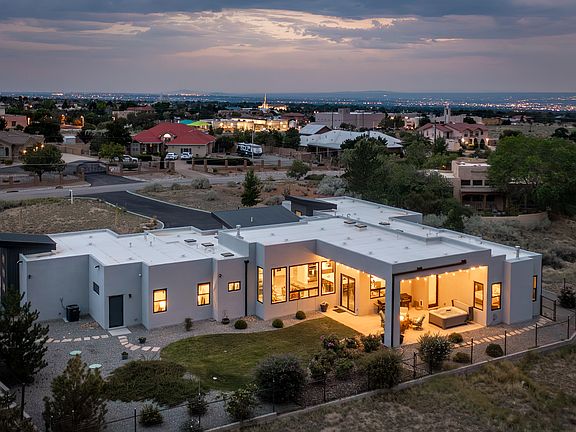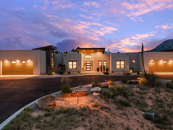 Discover your dream home in North Albuquerque Acres! 3 category Parade of Homes winner in 2022. This stunning contemporary custom residence boasts breathtaking views of the Sandia Mountains and features a rare 6-car garage, perfect for car enthusiasts or extra storage. With two luxurious full baths, this multi-generational layout offers comfort and privacy for everyone. Enjoy the convenience of an asphalt driveway leading to your private oasis. Located in the coveted La Cueva school district. The amazing kitchen is a chef's delight, featuring custom cabinets, a butler's pantry, and a 5x10 quartz island for entertaining. Energy-efficient and equipped with a private well, this home combines luxury with sustainability. Don't miss the chance to make this exquisite property yours!