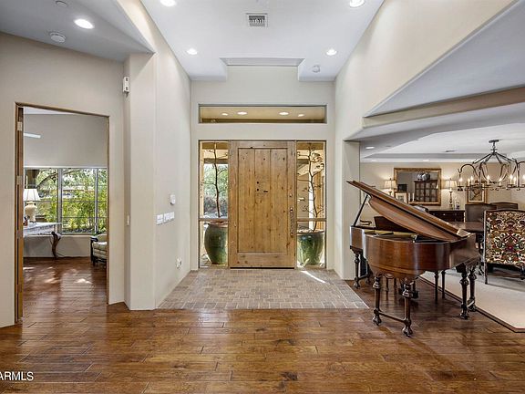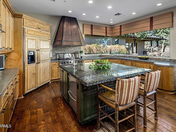 Privacy and luxury are what you notice as you walk across the gated, fountain kissed, courtyard at the entrance of this Scottsdale estate. Lodge-like, with solid block wall construction, reclaimed wood beams and stone accent walls, this custom, multi-generational theme has comfortable space for all. 3 spacious en suite bedrooms and an immense Primary wing in the main residence, paired with an attached, 1 bedroom casita with private entrances allow every member of the family and guests to have comfortable space. The flex-design includes a private office and a multi-purpose room for tv, toys, a library, or visits. The purposefully created floor plan also offers 5 sets of french doors which open to the 1,568 sf wrap-around patio with fireplace, overlooking the green lawn and
