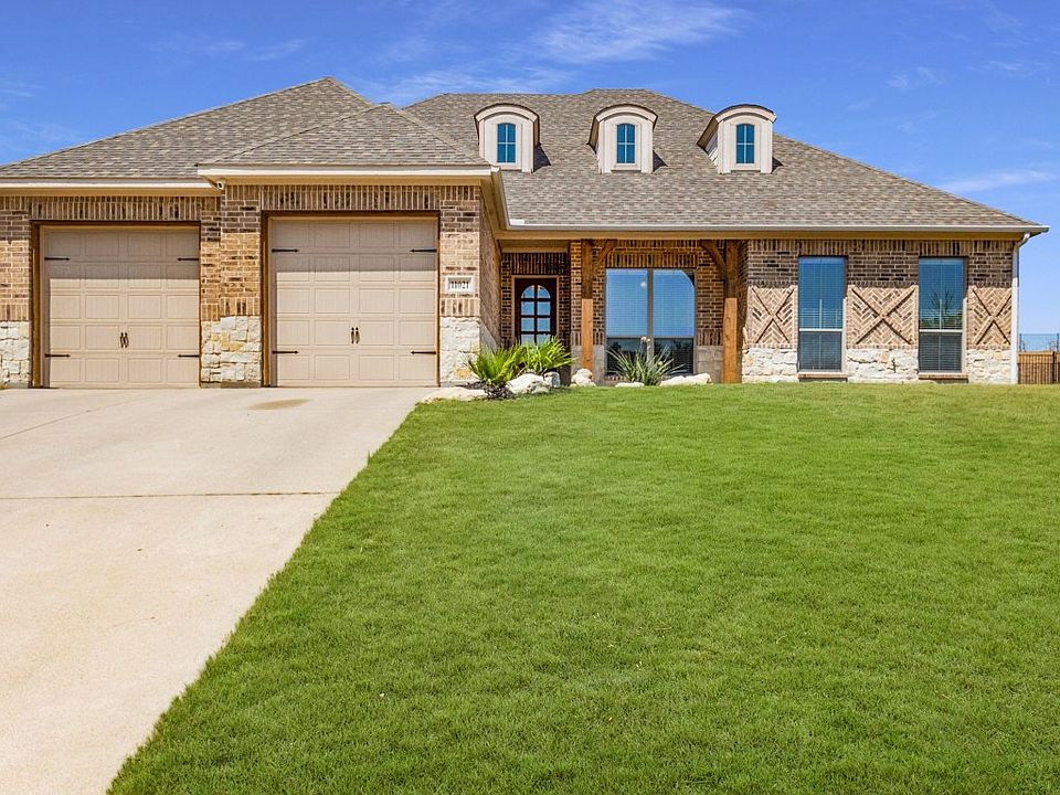 *BEST VALUE IN LAGO VISTA COMMUNITY!* You will love the curb appeal and unique style of this gorgeous home with the arched dormer windows, brick & stone facade and cedar accents! This move-in ready house has such an elegance to it that is hard to capture in photos... you must come see it in person to truly appreciate it. Flex space has been converted into an English style pub with built-in cabinets, shelving and moveable bar. Oversized living area with stone fireplace is perfect for entertaining with the open concept kitchen overlooking it. Dining area is light and bright with many windows and a high domed ceiling. Large primary suite has a luxurious bath with marble countertops, dual sinks, garden tub, separate shower and huge walk-in closet. Split bedrooms. Amazing yard is over one third acre will hilltop views from the front porch. Covered back patio and iron fencing. HVAC 2016. Community pool. New Eagle Mountain High School being built down the road!