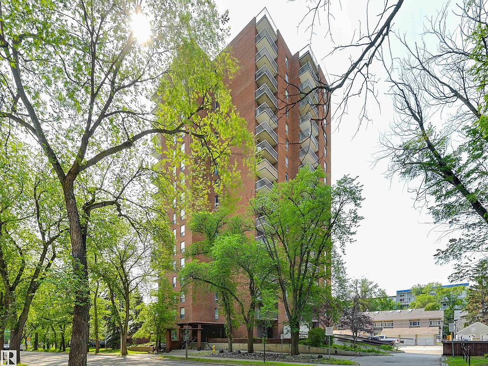 DOWNTOWN & RIVER VALLEY VIEWS from this spacious 1 bedroom 868 sq.ft. condo in CLARIDGE HOUSE conveniently located steps to the U of A, close to transportation, restaurants, coffee shops & quick access to Whyte Avenue & Downtown. Open concept layout with the kitchen open to the dining & living room. Oak cabinetry with lots of storage. Vinyl plank flooring in the dining & living room. Step onto the east facing balcony with great views of Downtown & the river valley. Also, there is a storage room on the balcony. 4 piece bathroom next to the primary suite. Included is the fridge, stove, dishwasher, INSUITE WASHER & DRYER, A/C & TITLED UNDERGROUND PARKING #112. The condo fees include all the utilities & the building maintenance, management & caretaker. Party room & visitor parking.
