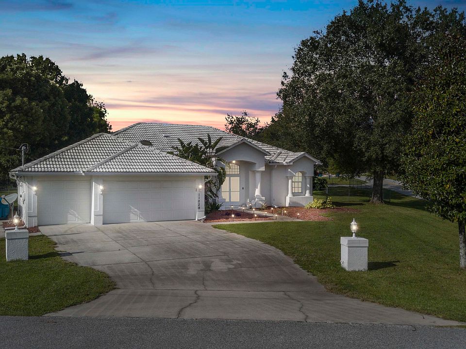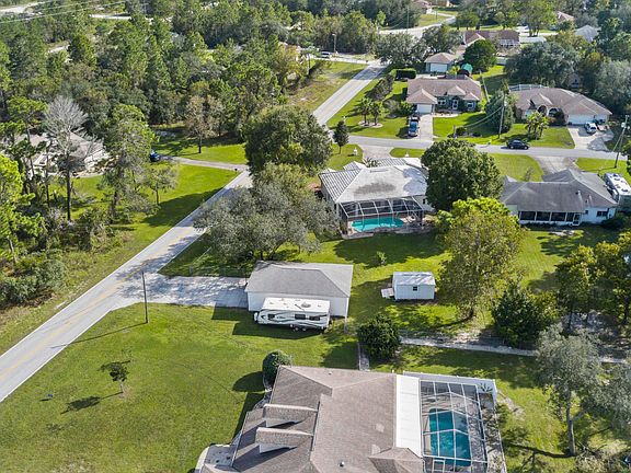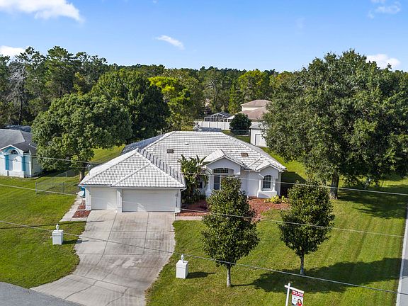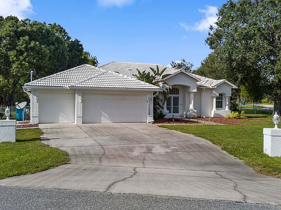 Active w/ Contract. MOVE IN READY 3 Bed 2 Bath 3 Car Attached + 24X40 detached Garage on a FULLY FENCED half acre corner lot! This OPEN layout features a living room, dining room and eat in kitchen. The kitchen has white cabinets, breakfast bar & newer stainless steel appliances. Master suite is large with access to the pool/lanai, dual vanities, garden tub and walk-in shower. Split plan, 2 additional bedrooms with walk-in closets are located on the other side of home, sharing a hallway w/ full pool bath. Indoor laundry room is very convenient with cabinets for extra storage. Enjoy spending time by the pool in this large covered lanai with serene waterfall in pool. Shed with electric. Drainfield replaced 2 years ago and NEW pool pump! Schedule your showing today!