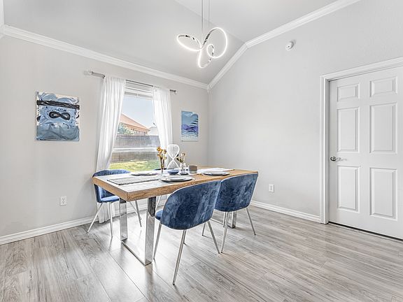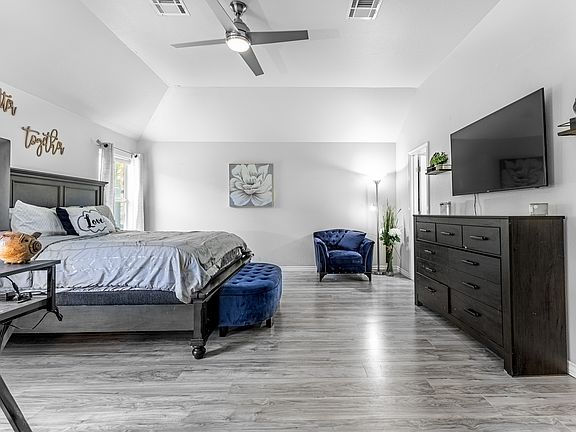 The kitchen features ample cabinet space, modern appliances, and a convenient breakfast bar that opens up to the dining and living areas. The master suite includes a walk-in closet and private bathroom with dual vanities and a soaking tub.