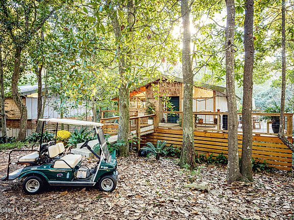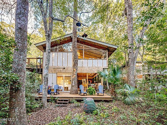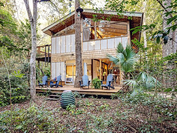 Discover a true architectural treasure tucked beneath the oaks of Ocean Springs....... Designed by renowned architect Carroll Ishee, this custom-built home is rumored to be one of the final homes he built before he passed away. Every detail tells a story—from the handcrafted finishes and natural materials to the walls of glass that invite the outdoors in. Thoughtfully designed to complement its serene coastal setting, this one-of-a-kind residence offers an open, organic floor plan with soaring ceilings, exposed beams, and warm textures throughout. Enjoy peaceful mornings surrounded by nature, evenings under the stars, and a lifestyle that perfectly balances privacy with proximity to all that makes Ocean Springs special—downtown shops, restaurants, the vibrant arts scene and of course, the beautiful white sandy beaches - all just a short golf cart ride away. The kitchen features stainless stove/oven, dishwasher, refrigerator & sink, Silestone countertops, and original butcher block peninsula. The primary suite leads out to a beautiful spacious deck, viewing acres of untouched woods. There is also an additional deck on the first floor with a giant tree growing through the deck, perfect for your evening wine. There are so many unique features, including open floor plan, high ceilings, tons of glass, natural stone, two living rooms (one on each floor), jacuzzi tub, separate laundry room (featuring a laundry chute from the primary bedroom/bath), bonus space with a built-in Murphy bed (perfect for extra guests), and a stunning Noguchi pendant above dining table. Sit back, coffee in hand, on the 13.5' sofa overlooking the creek when it rains and watch the turtles dive in. Outside is a storage building (which will remain), perfect for storing bikes, beach toys and fishing gear. Also on the property is a firepit area, a treehouse, and lots of additional storage underneath the large deck (perfect for kayaks). There is plenty of extra space on the property to later add a garage or storage if you need room to expand! This masterpiece is thoughtfully decorated by New Orleans based designer, Betsey Hazard (of House of Hazard Interiors), lovingly maintained by the current owners and now waiting for its next steward to appreciate its craftsmanship and character.. This isn't just a home—it's a piece of Ocean Springs' architectural history. Priced to sell, don't wait.