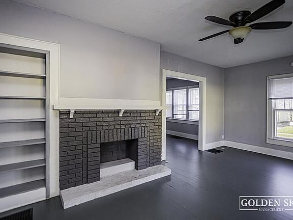 Large open living room with a fireplace, built in shelving and ceiling fan.