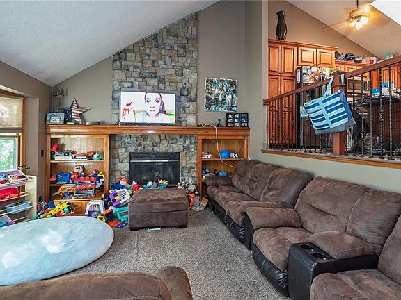 Stone fireplaceFinished recreation roomOpen livingSub-basement for additional storage