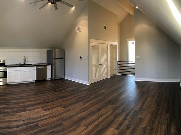 Open concept layout that seamlessly combines sleeping, living, and kitchen areas. The 15' vaulted ceiling adds an airy and spacious feel, complemented by recessed lighting and a sleek 6' fan for optimal circulation.
