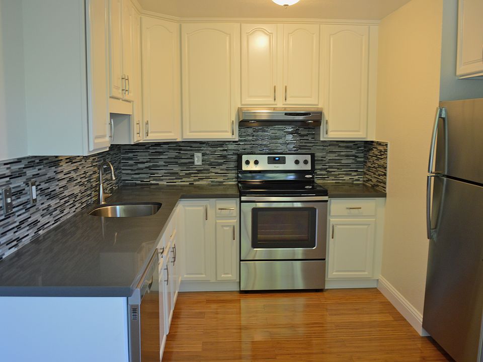 Dark quartz countertopsStainless steel appliancesHardwood floorsGarbage disposalAmple closet space