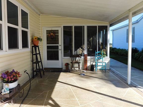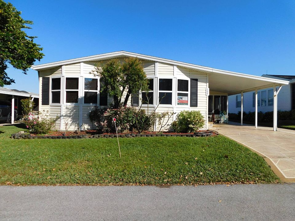 Step into this stunning 1994 Palm Harbor home offering 2 bedrooms, 2 bathrooms, and 1,428 sq. ft. of comfortable living space (51' x 28').Outside, you'll love the enclosed Florida room and the dedicated golf cart driveway that leads to a covered parking area-also perfect as a peaceful patio space with no rear neighbors. A spacious shed houses the washer and dryer and provides abundant storage for all your extras. One of the home's standout upgrades is the brand-new shingle roof installed in February 2025. Enter the home through the Florida room and you're welcomed into an open, inviting floor plan ideal for daily living and entertaining. The kitchen features stainless steel appliances, ample counter top and cabinet space, and a charming breakfast nook. Just off the living room is a cozy family room complete with a fireplace. Both bedrooms offer en suite bathrooms with stand-up showers and relaxing garden tubs. Best of all, this beautiful home comes fully furnished-move right in and enjoy!