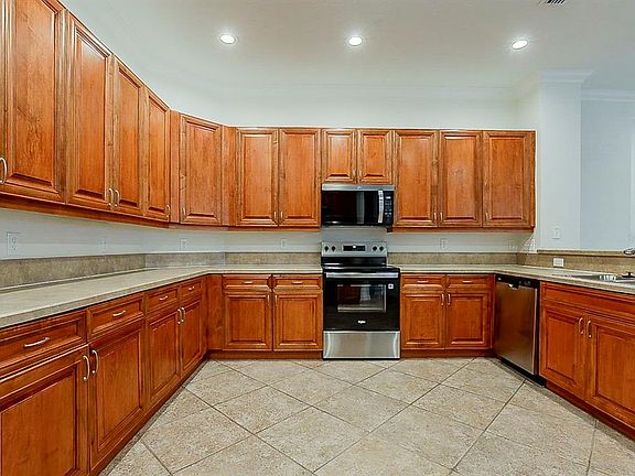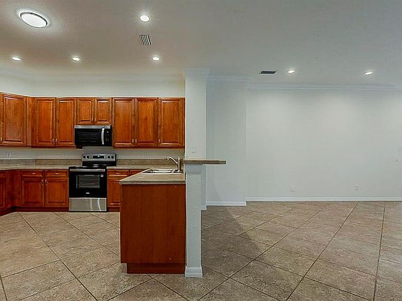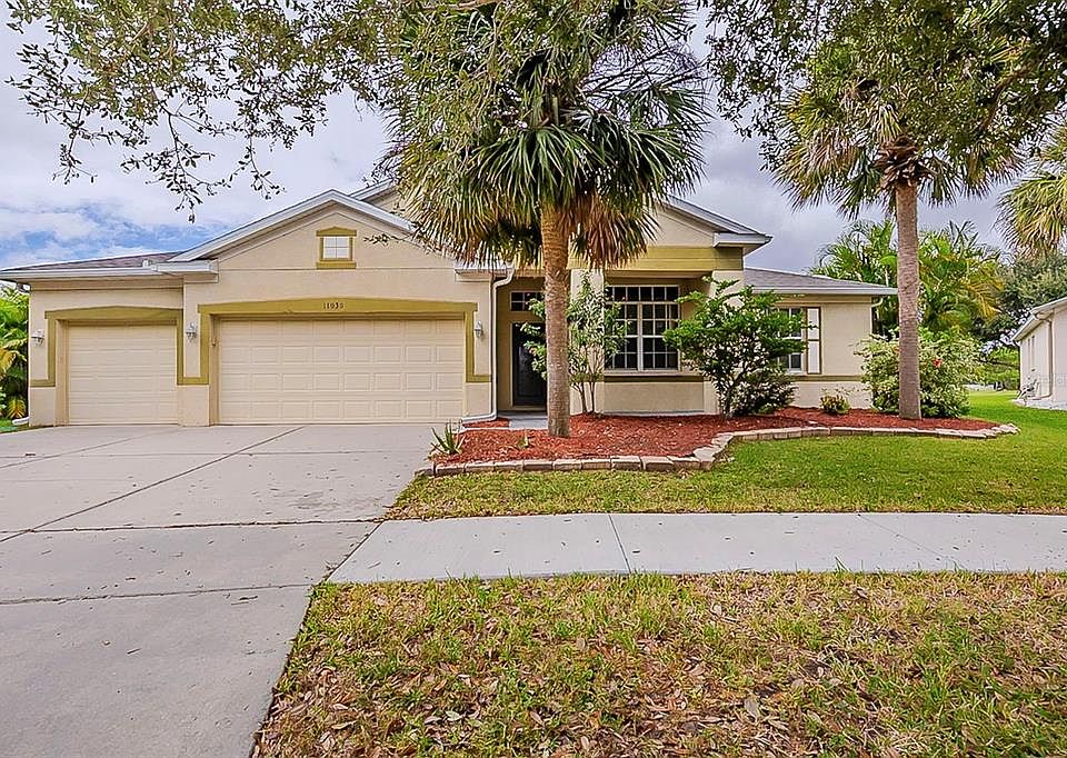 One or more photo(s) has been virtually staged. Stunning 1-story home offering 4 spacious bedrooms and 3 bathrooms in a beautifully designed open floor plan. The kitchen features an island, kitchen bar, and accent lighting that adds warmth and style throughout. Enjoy the luxury of a 3-car garage and a private outdoor oasis with an enclosed lanai and sparkling pool—perfect for relaxation and entertaining. The covered porch with lanai extends your living space outdoors. The primary suite boasts a double vanity, separate tub and shower, while another bathroom also offers a double vanity for convenience. Primary bedroom features elegant double glass doors that open directly to the backyard porch with a pool view. The fenced backyard ensures privacy and security. Schedule a showing today! One or more photos have been virtually staged.