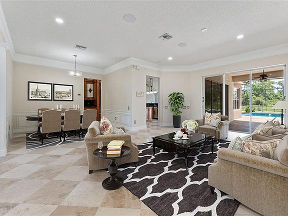 Stunning WATERFRONT EXECUTIVE POOL HOME with 5 BEDROOMS 3.5 BATHROOMS 3 CAR GARAGE + 0.45 ACRES! + Conservation Views in Fully Fenced in Backyard with 2,750+ square feet of living space in the GATED community of GLENMUIR, one of Windermere’s most desirable communities! Open entering the foyer with a travertine medallion inlay, this home boasts upgrades and a wonderful true split plan. The 5th bedroom, which could also be a perfect office or bonus room is at the front through double doors. The space moves on to present a large formal living and dining room area, highlighted with a chair rail above board and batten accents, as the travertine tile expands throughout the home, with a view of the pool, water and conservation through triple glass sliders. The custom kitchen remodel includes granite countertops and backsplash, stainless steel appliances including an induction range top oven, built in Thermador Espresso/Coffee machine, pot holder above kitchen island, custom stained glass cabinet inserts, an extended butler’s pantry towards the dining room, along with extra storage including pull out spice racks. The primary bedroom is very spacious with triple glass slider access to the covered pool patio area. The primary bathroom is complete with a dual vanity, garden tub and walk in shower, including a large walk in closet. The kitchen opens to a large great room that separates an additional section of the house that includes 3 bedrooms in one hallway. One bedroom has its own en-suite with another having en-suite access to the hallway bathroom. The covered pool patio area has access to a separated bathroom, with a very large extended pool deck with a fully screened in SALTWATER SOLAR HEATED POOL with SPA. This backyard is a very large lot, fully fenced in with black aluminum, next to open conservation space both beside and behind the water views making it very private. This home also features a TILE ROOF, wash sink in the laundry room, crown molding, large 3 car garage, and kitchen under and above cabinet lighting. Glenmuir features community amenities that include a waterfront park with playground, basketball court and covered pavilion with picnic tables and grills. Make an appointment to see this home today!