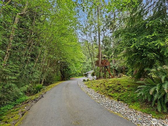 Ultra-private 2,950 square-foot home has everything! Kitchen features a generous island & stainless appliances. Family room's river rock fireplace adds warmth. The dining room opens to a STUNNING outdoor entertaining area. Surrounded by greenery while enjoying a 2,000 sq-ft partially covered deck with dining area & patio with custom 11-foot river rock fireplace. Yard space all around with trees beyond offer total privacy. Quiet primary suite has walk-in closet & spa-like bathroom (heated floors, multiple shower heads). Three additional bedrooms, full bath, bonus room & dedicated home theatre complete the upper level. Oversized garage bay (16X36) leads to separate shop (not in sq ft). Carport, chicken coop/dog run, Awesome Tree House! No HOA