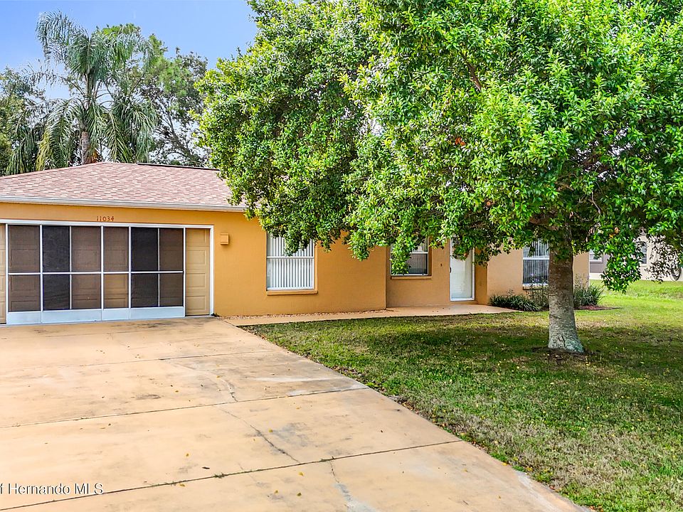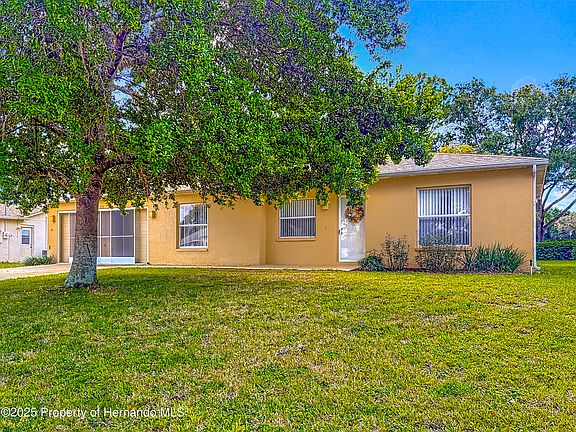 Nestled on nearly a quarter-acre of land, this delightful move-in ready home offers the perfect blend of comfort and functionality. As you enter the foyer, you'll be greeted by a bright and airy living and dining combination. The soaring cathedral ceilings immediately create a sense of openness, allowing natural light to cascade throughout the space. Whether you're hosting gatherings or enjoying quiet evenings at home, the flowing layout is both inviting and versatile. The living area seamlessly connects to the dining space, making it easy to arrange your furnishings for maximum comfort and style. Open to the living and dining areas, the kitchen is designed with both efficiency and enjoyment in mind. There's plenty of counter space for meal prep, as well as a dedicated area for casual dining. Retreat to the spacious master bedroom with a walk-in shower with the ensuite featuring a tile shower. The second bedroom is generously sized, making it ideal for guests, family members, or a home office. The adjacent second bathroom is equally impressive. One of the standout features of this lovely home is the screened lanai, accessible through sliding glass doors from the dining area. Outfitted with blinds for added privacy and shade, the lanai is the perfect spot to enjoy your morning coffee, unwind with a good book, or entertain guests in a bug-free environment. Step outside and you'll find an expansive backyard—a true haven for outdoor living. A separate area with pavers provides a dedicated space for grilling. There's plenty of room for pets to play, for kids to run, or to plant a garden and embrace your green thumb. This home comes with a host of recent improvements designed to provide worry-free living for years to come. The roof and AC were both replaced in 2021, with a newer water heater, sprinkler system, and recently painted exterior. A true plus for homeowners is the attached two-car garage, complete with screens. This home is minutes from the famous Weeki Wachee live mermaids, Pine Island Park and Roger's Park for fun on the water. Close to the Suncoast parkway for quick access to the airport, Tampa, Clearwater and St. Pete Beaches (Ranked in the top 5 Beaches in the US), also close to the famous Tarpon Springs Sponge Docks. Enjoy everything Tampa Bay has to offer. Go just to the north and you'll find Chassahowitzka National Wildlife refuge, Homosassa Springs, Crystal River and Cedar Key on the Suwannee Sound. Beautiful gulf and river boating, terrific fishing, TOP US BEACHES, golfing, cultural entertainment, and museums...and of course beautiful year-round weather - all within your reach! NO HOA OR CDD FEES!