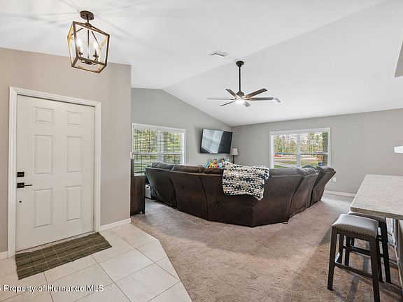 Built in 2022, this thoughtfully designed 3-bedroom, 2-bathroom home sits on just under half an acre and offers a welcoming blend of comfort and space. A covered front porch with plenty of room for outdoor furniture invites you to sit and enjoy the quiet surroundings. Inside, the open floor plan features tile flooring in the entry that transitions to plush carpet in the living room, which is highlighted by cathedral ceilings and large windows that fill the space with natural light. The dining area sits just off the living room and opens to a covered rear porch through sliding glass doors, creating an easy flow for indoor-outdoor living. The kitchen is tiled with granite countertops, a breakfast bar, and an open layout that connects seamlessly to the living areas. The primary suite includes carpet, three windows, a walk-in closet, and a private bathroom with granite countertops, dual sinks, and a step-in shower. The additional bedrooms also feature carpet, ceiling fans, and built-in closets. The second bathroom has a granite vanity and a tub-shower combination. A convenient inside laundry room adds to the functionality of the layout. The backyard is partially shaded and includes a covered porch with a ceiling fan, and the side yard borders a wooded area that adds a touch of nature and privacy. Located approximately 6 miles from the Suncoast Parkway, this property offers an ideal location for commuters heading to Tampa or other nearby areas. For recreation, Weeki Wachee Springs State Park—famous for its crystal-clear spring and kayaking opportunities—is just 6 miles away, while Pine Island Beach is around 11 miles away, offering a serene spot to watch the sunset over the Gulf. For shopping and dining, Coastal Highway 19 is just a short drive east, with a variety of local options.