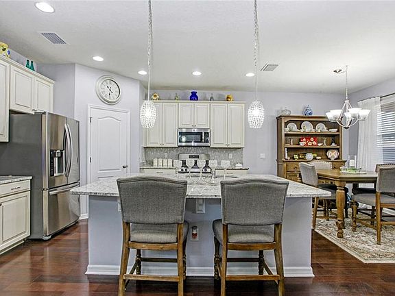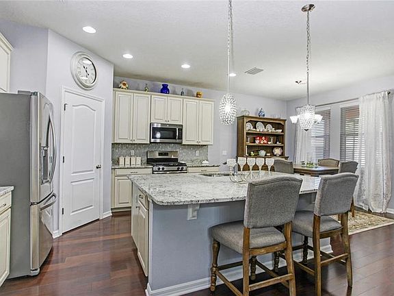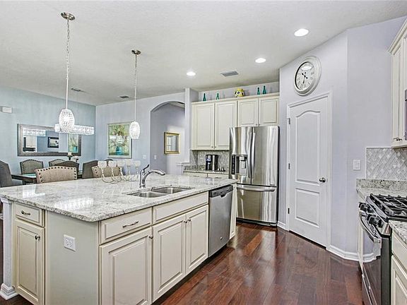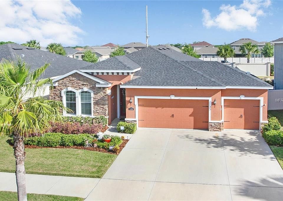 All the details you've dreamed of in this one story 3/3/3 newer home with OFFICE and so many upgrades. As you walk up to the front door you will notice the freshly landscaped yard. Upon opening the front door you will notice its light and bring feel and dark hardwood flooring throughout. The guest bedroom is to the left and has its own private bathroom and office that connects to the bathroom offering it its own personal suite to the front left of the home. The kitchen is amazing with granite countertops, solid wood upgraded cabinets, backsplash, stainless appliances and great light fixtures that will make you happy. There's room for entertaining with the nook, dining room area and a great room all together. The master bedroom includes a walk in closet and the master bath has a quartz double sink vanity, walk in shower, and separate garden tub. The is also another bedroom and separate bathroom. The outside backyard is completely fenced and no backyard neighbors. The only screened in porch was recently added for some outdoor living space and extended to 10x15. There is solar motion detected lights in the back porch area. The 3cg garage offers lots of space and has lots of shelving. There is also a Whirlpool Water Softener/Filtration system. Lake Lucaya is very convenient to I75 and lots of shopping and schools. This newer subdivision offers pools, lots of ponds, parks and a clubhouse. This community also features a dock on the lake and a small beach like area.Don't miss the chance to see this one today!