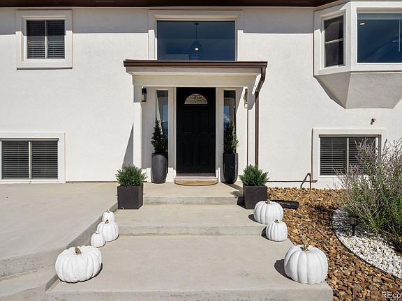 Stunning 4 bed, 3 bath home on 5 fenced acres with AMAZING Pikes Peak views and D20 schools! Great location with plenty of space to spread out but close to everyday amenities. The open floor plan have an excellent design to make this home feel much larger! Entering the home you will be wowed by the modern entry and stairs with rod iron that lead you to the main floor. Gorgeous luxury vinyl plank flooring graces the open floor plan of kitchen, living and dining areas. Bay window in living area provides spectacular front range views. Upgraded white cabinetry and quartz counter tops - plus a huge island, beverage fridge, and stainless steel appliances. Vaulted ceilings and skylights in the dining room with access to lower level via spiral staircase! Master retreat with sitting area, adjoining bathroom & walk-in closet. A bright and welcoming second bedroom is also on the main level along with another full bath with updated vanity and tile flooring. Two separate staircases lead you to the lower level which has garden level windows, all new luxury vinyl plank flooring and two more generous-sized bedrooms and full bath with walk-in shower. Two bonus rooms on the lower level can be used to suit your needs - 5th bedroom, gym, library, home office, etc. The home also has a newer high-efficiency furnace, new AC and whole house humidifier, newer hot water heater, new water softener, newer windows, reverse osmosis, whole house back up generator, new well pump, and more. The exterior features new white stucco and paint, new fencing round entire property, new concrete patio and steps, a large deck off, a second shaded seating area with pavers, xeriscaping, trees, fenced garden area, horse panels , round pen and wire, swing set and above ground pool! There are also two out buildings, plus a loafing shed. Property line goes all the way back to the blue house. Bring your dogs and horses. No HOA nor covenants. Close to shopping, parks, schools and the Powers corridor.