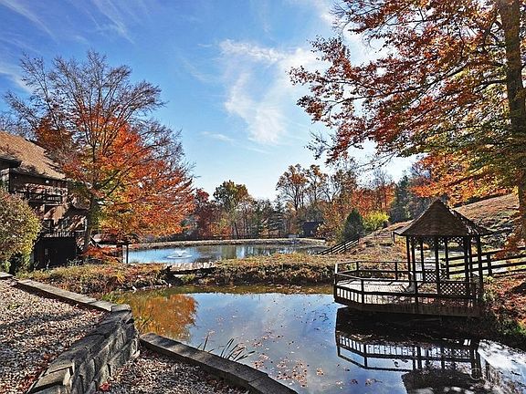 Private 90' bridge entry leads you into a unique estate featuring a 2.5 heated garage, wooden decks on all three flrs overlooking lakes, woods, pasture & gazebo. Cedar barn 30 x 120 ft. with 1/2 bath, heated 30 x 50 area, 4 horse stalls & a shop area. The home is made of cedar & stone with 5 bedrooms, 4.5 baths & 2 fireplaces. The great room has an area with a 26' cathedral ceiling & 30 wall that is all glass overlooking the lake. Home also features an open entry w/a beautiful spiral staircase.