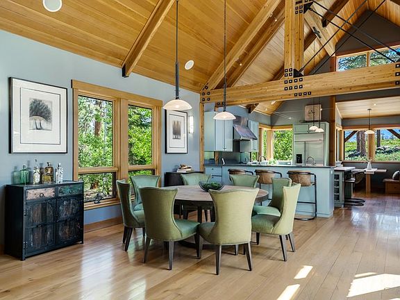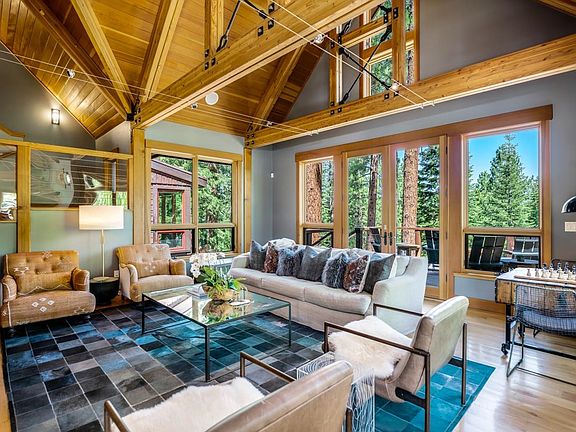 Located outside Truckee in esteemed Juniper Hills, this masterfully-crafted home designed by Ward Young sits on a private lot featuring forested surroundings and distant mountain views. Generous outdoor living includes back upper and lower decks with outdoor hot tub plus two stone patios--one complete with fire pit. Delightful open kitchen & breakfast nook plus luxury master bedroom on main level with home theater on lower floor. 5 car garage in all! The separate 2-car garage boasts a second-level studio.