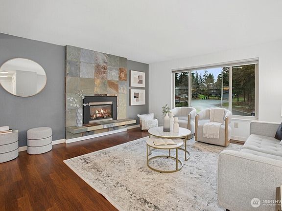 Tucked at the end of a quiet cul-de-sac, this Mid-Century Modern home blends seamlessly with nature, offering privacy, tranquility, & space to breathe. A stone tile fireplace anchors the inviting living space, flowing into the kitchen & dining areas, then out to a spacious deck—perfect for coffee with birdsong or dining al fresco. Beyond, a large fenced lot invites gardening, play, or quiet reflection against a private greenbelt with a meandering stream. The main level features a primary bedroom with a convenient ¼ bath which connects to the full hall bath. Downstairs offers a bonus room, extra bedroom/office, another full bath with utility area, & garage access. A wired shed provides extra space. A rare Bothell retreat—will it be yours?