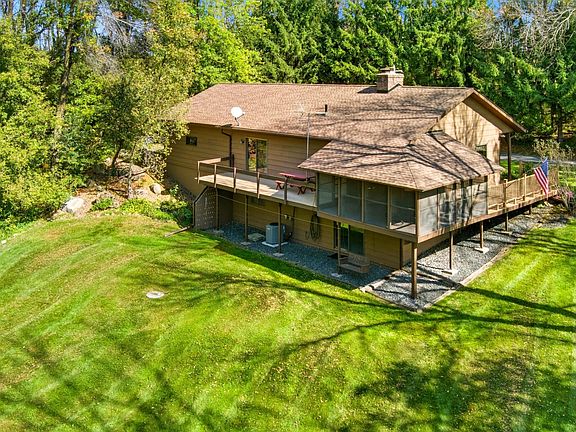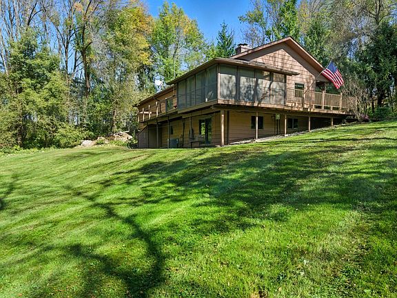 Do not miss out on this nice 3-bedroom, 2-bath home situated on a very private and picturesque wooded 5 acres! The house features a beautiful 2-sided wood-burning stone fireplace on the main level with an additional wood-burning fireplace on the walk-out lower level, a separate formal dining room, Andersen Windows, ample storage on the lower level and a primary main floor bedroom with dual closets that also has a sliding glass door that leads out to a deck. The kitchen has custom oak cabinets with roll out shelving, an appliance garage, two built-in cutting boards and 2 Lazy Susans. When it is time to relax outside, the home provides ample opportunity with two decks and a large 16 X 15 screened-in porch where you can enjoy the peaceful views and wildlife. If it is storage or a large workshop that you are looking for this property has you covered with a 32 X 28 outbuilding that features a concrete floor, heater, and a 14 X 12 overhead door. The roof on the home was replaced in 2022 with a warranty that is transferable to the new owner. Conveniently located just minutes from I-94 this would be a wonderful place to call home!