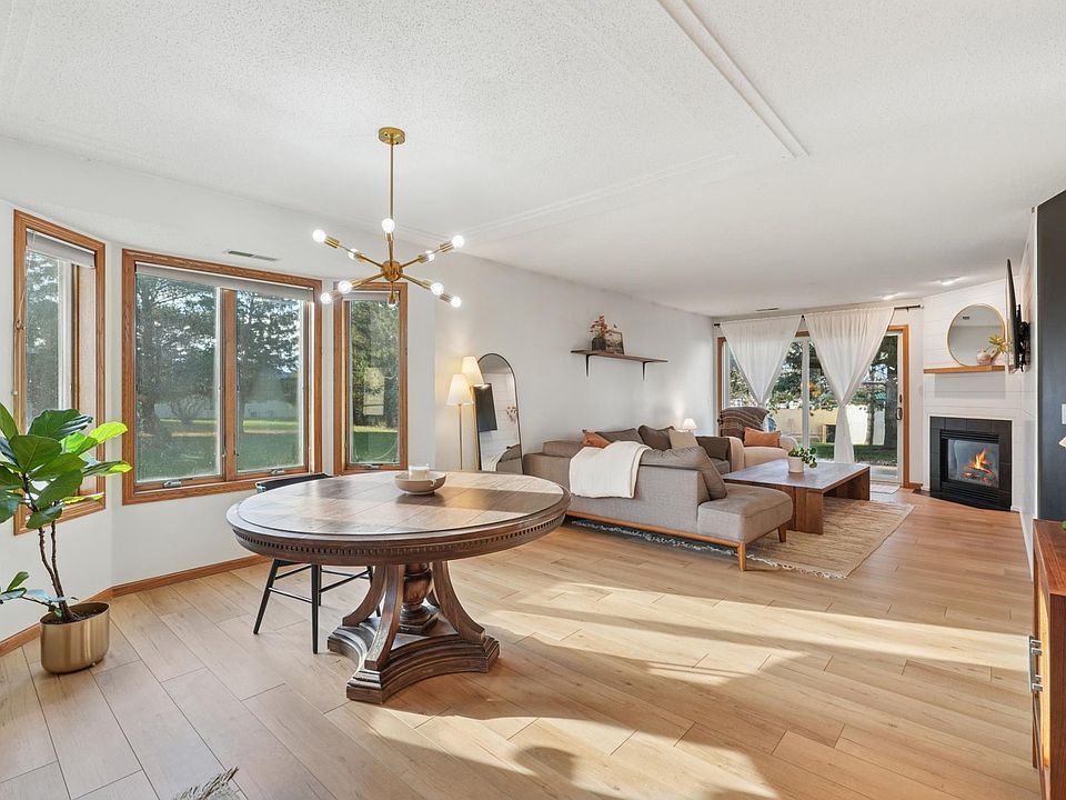 Tile backsplashNew appliancesBoard and batten accentsAdded storageInviting shiplap fireplaceStylishly refreshed kitchenTiled floors