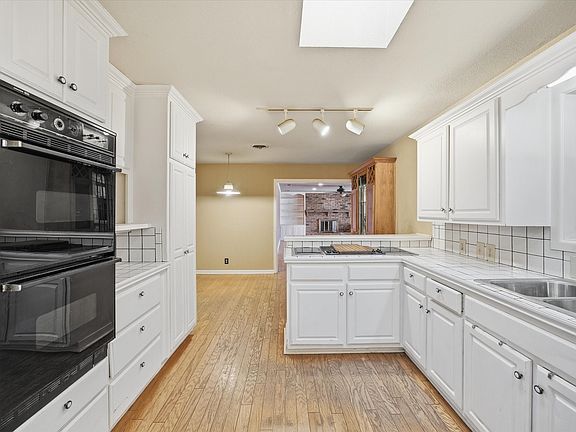 Set along a peaceful street framed by mature trees, this brick home caries a timeless ease. The living room has always felt like the heart of the home, with wood floors and anchored by a brick fireplace surrounded by built in bookshelves with cabinet like doors-creating a natural backdrop for family photos, well read books and the little treasures collected over the years. Natural light from the skylight guides you toward the kitchen, where morning light spills across the white cabinets and tile countertops. The double ovens, electric cooktop and open counter space makes cooking feel effortless. Just before the kitchen, sits a built in hutch with drawers and a mini fridge making it the perfect stop for grabbing a cold drink or quick snack before heading out for the day. The formal dining room has a way of gathering people, no matter the occasion. Whether it was a holiday feast or a simple meal shared after a long day, the room feels like a place where conversations linger long after plates were cleared from the table. The primary bedroom feels like a retreat, tucked away with a generous 6 x 12 walk in closet featuring built in drawers, shelving for your favorite pairs of shoes and abundant hanging space to display your wardrobe. The primary bathroom extends the comfort with dual sinks, full length mirror aligning the countertops, a skylight overhead allowing in for natural light and a walk in shower equipped with supportive rails. Out back, the 25 x 14 patio has been the backdrop for countless memories-birthday parties, summer dinners, quiet mornings and starlit nights. The wooden privacy fence wraps around the backyard where two sheds-one being a 17 x 9 shed with electricity and a window unit making it the ideal space to create art or store holiday decorations. The two car garage includes three separate closets so storage is never in short supply. If you're looking for a place where life naturally happens and memories take root, come see where your story begins.