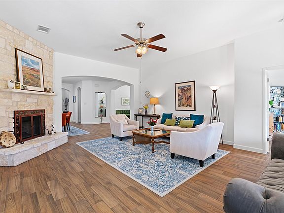 Impeccably maintained and conveniently located, this spacious home in the Teravista community backs to a peaceful neighborhood green area and welcomes you with easy-care landscaping and a mature tree that enhances its curb appeal. Inside, an open floor plan features expansive windows and recently installed wood-look tile throughout the main living areas. The inviting living room centers around a striking floor-to-ceiling stone fireplace and flows seamlessly into the kitchen, which offers granite countertops, a double island, abundant dark wood cabinetry with pull-out drawers, stainless steel appliances, a pantry, and a convenient built-in desk nook. Enjoy casual meals in the breakfast area or host special occasions in the formal dining room. A nearby flex space adds versatility—ideal for a sitting area, study space, or creative hobby room. The spacious primary suite features an ensuite with a dual vanity, soaking tub, separate shower, and a walk-in closet. Three additional sizable bedrooms offer exceptional flexibility for guests, family, or a home office and share a well-appointed full bath. Outside, the fenced backyard features a large covered patio overlooking the green area—perfect for relaxing with your morning coffee or unwinding in the evening as you enjoy the view. Located in a prime area, this home is walking distance to the elementary school and a short drive to Southwestern University, Gateway Prep School, and endless shopping, dining, and recreation options. With easy access to I-35, US-79, and TX-130, plus resort-style neighborhood amenities—including a scenic lake park and pool just a few steps from the home, along with walking trails, playgrounds, tennis courts, and a championship golf course—this property truly offers the best of Teravista living.