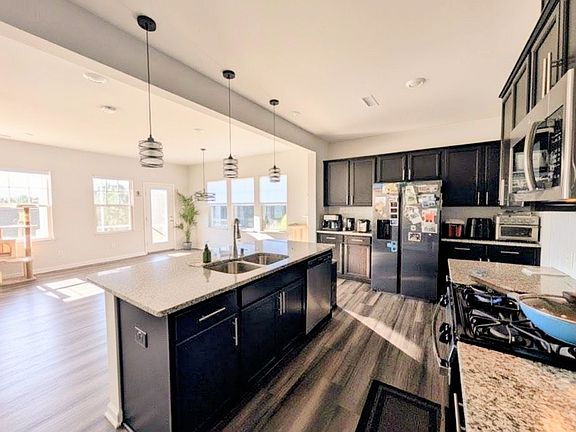 - Modern kitchen with granite countertops, large island, walk-in pantry, stainless steel appliances, and gas range