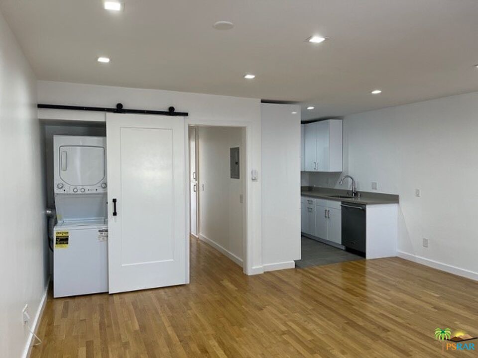 Gorgeous turn key one bedroom one bath with in unit washer and dryer. Newly renovated and beautifully updated by designer. Loads of natural light & bright, open & spacious 1 bd/1 ba turn key apartment. Welcome home to the perfect combination of modern amenities with California Contemporary charm designed by Architrave Interiors. The open living room with huge windows allowing light to pour thru & high ceilings create a warm living space leading to the dining area & the modern kitchen complete with Caesar stone counter tops, new cabinetry, stainless steel appliances, & farmhouse sink. Generous sized bedroom & gorgeous modern bathroom with new lighting, vanity and a soaking tub.-Hardwood Floors throughout living space,- new plush carpet in bedroom-Recessed lighting throughout the unit.-New Washer/Dryer in unit behind a chic sliding barn door,-window A/Cs- 1 car covered parking available,- ample storage space. Small complex on a quiet street in the heart of Miracle Mile, close proximity to the Grove, LACMA, *NEW* Academy of Motion Pictures Arts & Sciences, Beverly Hills, restaurants, retail shops, the upcoming Wilshire Metro Station, and freeways.