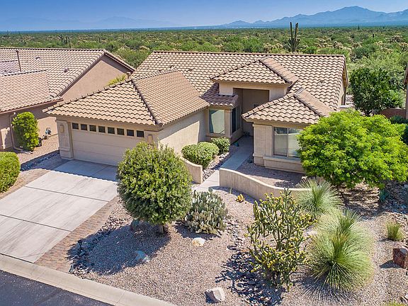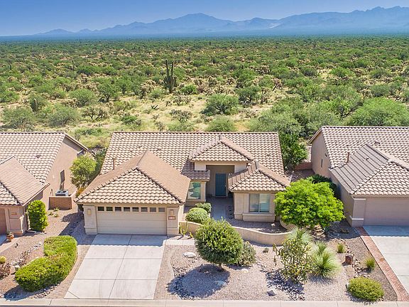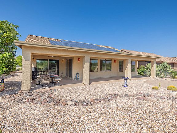 * Freestanding 2/bedroom/2/bath + den. Priv lot backs up to protected desert range. Unobstructed views of mountains, sunrise & sunset. Walled brick courtyard. Oakmont floor plan, tile floors, vaulted ceilings & expansive windows. Updated kit w/stainless steel appliances, granite counters, custom cabinets & breakfast nook. Master BR suite has bay window, db vanity, walk-in closet & large shower. Guest BR has queen sized Murphy bed. Den also has queen Murphy bed. 2 car garage w/epoxy floor, utility sink & workbench. All appliances convey as well as BBQ. Roof replaced in 2020. Owned solar panels. Ramada & expanded patio w/beehive fireplace perfect for Tucson's outdoor lifestyle. Quail Creek CC incl pool/spa, golf courses, creative art center, tennis & pickle ball, athletic club & restaurant.