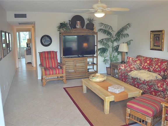 This much desired home has 2 beds and 2 full baths. Tastefully furnished 1st floor unit with South Florida charm. Fully enclosed Florida room leads out to a generous lawn and on to a beautiful lake view. The home is sold furnished minus all personal belongings. Kitchen is updated with clean white cabinets and beautiful countertops. Bathrooms have been updated with nice countertops and vanities. One with walk in shower and one with a tub. Giant walk-in closet in the main bedroom, and generous closet in the guest room. Guestroom sofa is a pull out with comfortable inflatable mattress. New hot water heater. AC approximately 4-years old. All appliances including televisions stay. Storage closet in the Florida room. Owners seeking a late May early June closing timeframe.