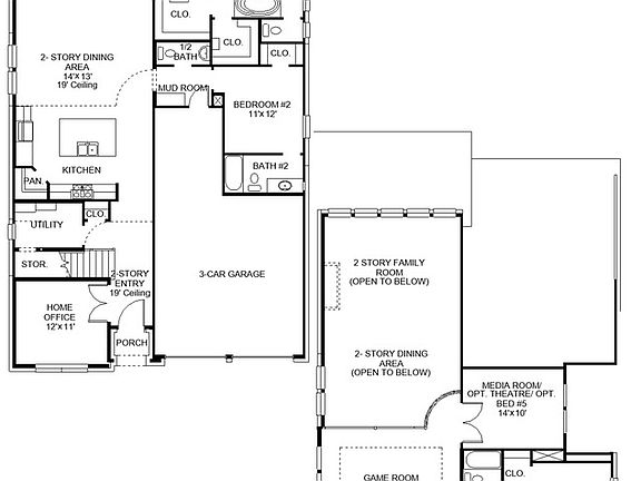 Home office with French doors set at two-story entry. Open kitchen hosts inviting island with built-in seating space. Two-story dining area opens to two-story family room with wall of windows. First-floor primary suite with wall of windows. Dual vanities, garden tub, separate glass-enclosed shower and two walk-in closets in primary bath. A guest suite with full bath is downstairs. Secondary bedrooms, a game room and media room with French doors are upstairs. All bedrooms include walk-in closets. Covered backyard patio. Mud room off three-car garage.