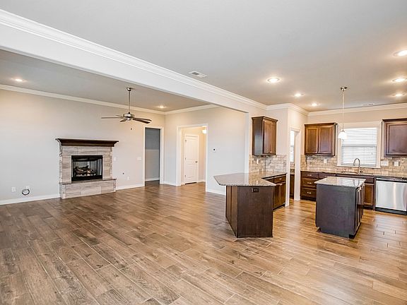 Split floor planCovered patioGas fireplaceGranite countersWood style tile flooring
