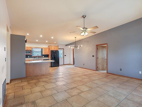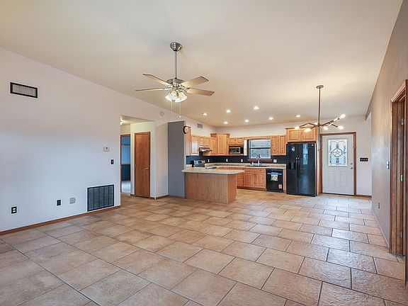 This 3 bed 2 bath Stucco home features a split floor plan, and is out of the floodplain. Features 9 ft. ceilings, recessed lighting, double-pane windows, and all-electric convenience. Tile flooring in main areas, carpeted bedrooms, and tile kitchen counters. Sequestered master suite, spacious utility room with cabinets, and large deck for entertaining. Includes a storage building and metal roof. This home blends comfort, functionality, and style—ready for its next owner.