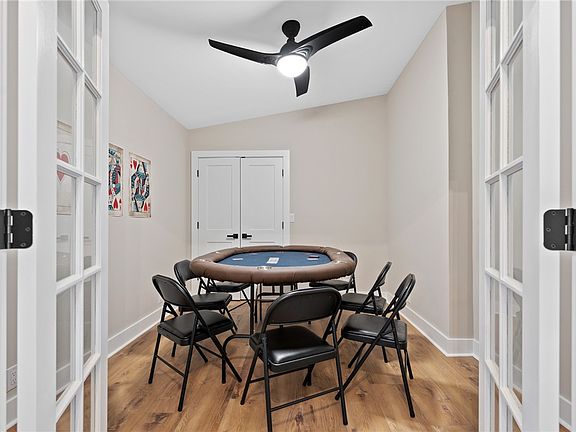 Step into a spacious open-concept den (with a built-in reading nook), dining area, wet bar, and gourmet kitchen, where the entire exterior wall facing the lake is made almost completely of glass from top to bottom with skylights throughout, offering excellent lake views and natural light from inside the house and connecting to porches for even more stunning vistas. The kitchen boasts an eight-burner gas stove, double oven, large island, and ample storage. The converted two-car garage is now a full arcade with pool table, air hockey, foosball, claw machine, and classic arcade games. The huge primary suite features a king-size bed, private balcony, a large walk-in closet, and a very large and modern bathroom with a beautiful glass shower, stand-alone soaker tub, double vanity, and separate toilet room, all with soaring vaulted ceilings. A half bath, a very large screened porch with a swing, and a very large open porch complete the upstairs, all featuring vaulted ceilings for a spacious, airy feel, accessible via a new deck with a fun slide to the lower level.