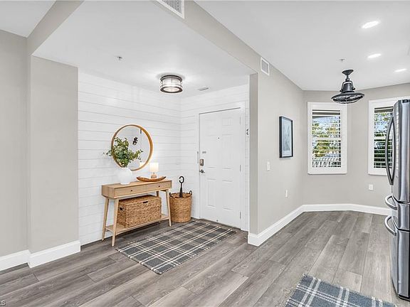 Experience exceptional value and coastal convenience in this beautifully updated 2-bedroom, 2-bath second-floor condo located in the gated community of Gulf Reflections—just 3 miles from the world-famous Fort Myers Beach and a short drive to Sanibel and Captiva Islands. This move-in ready home features a bright, open-concept layout with newer granite countertops, white shaker cabinets providing ample storage, and a spacious kitchen, dining, and living area perfect for entertaining. Elegant split barn doors lead to the primary suite, complete with a custom walk-in closet and remodeled en-suite bath with a granite vanity and tiled shower walls. The split-bedroom design offers privacy for guests, while the second bedroom includes a queen-size Murphy bed with built-in storage, making it both stylish and functional. Fully remodeled in 2021, this home boasts a new A/C, newer water heater, updated kitchen appliances, stackable washer and dryer, electric storm screen, and impact-resistant windows and doors for peace of mind. Vinyl plank flooring flows seamlessly throughout the unit, complemented by a tiled lanai. Additional conveniences include a covered carport, exterior storage closet, and a building that has been freshly painted with new gutters. Gulf Reflections offers resort-style amenities with a heated pool and spa, fitness center, clubhouse, and secure gated entry. Don’t miss this rare opportunity to own a turnkey condo in one of Fort Myers’ most desirable locations—schedule your private showing today!