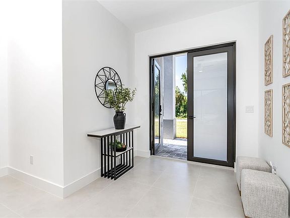 Modern entryCovered lanaiTall ceilingsLarge porcelain tile flooringPaver drivewayHuge walk-in closetFrosted double glass doors