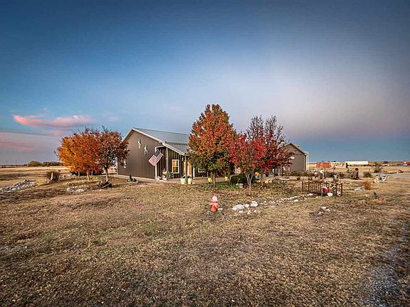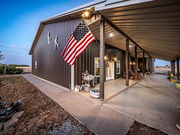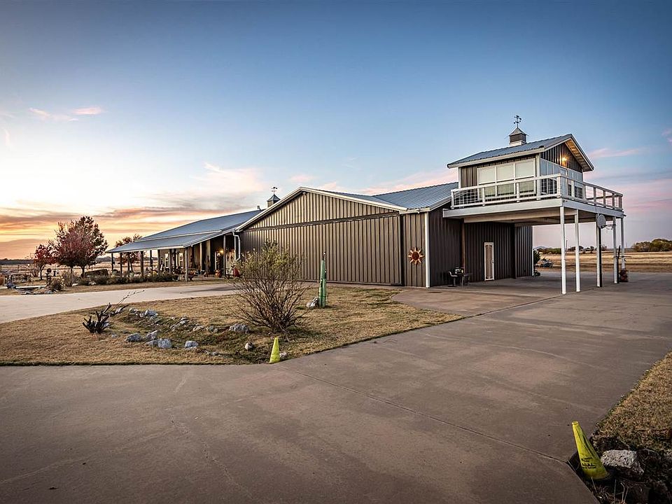 PRIVATE AIRSTRIP WITH HANGAR HOME! That is right! Own your own PRIVATE AIRSTRIP! A MUST SEE!! Check out this exclusive, custom hangar -- unlike ANY home in SW Oklahoma! A pilot's dream - Hangar home sitting on 60+ acres with a 2,000 ft concrete/blacktop runway. Taxi your plane into the Hangar and you are already home! Your hangar measures over 2,200 sq feet with a hydraulic door measuring 51 ft wide x 11 ft tall, framed with 5” x 3” rectangular tubing. The hangar door, built by Lanco Services, has two 5 ft hydraulic cylinders that lift the door. Included in your hangar, you will find a stairway to a one-of-a-kind “Crow's Nest Aviation Viewing Area”, consisting of 180 degree views as well as a wrap-around balcony. This 3 bedroom, 2.5 bath home is over 2,700 square feet and was a custom build in 2013. The 1,200 sq ft south facing front porch invites year-round outdoor enjoyment. Entertain your family and friends in the open concept, industrial kitchen with lots of extra features; butcher block counter-tops, 5-burner gas stove w/dual oven, pot filler, metal vent-a-hood with pot rack organizer, single unit industrial grade stainless steel sink/counter-top. A brushed stainless steel finish on cabinets, paired with butcher block, creates a sleek and contemporary look. Dining area consists of a 12 ft x 4 ft bar made of a combination of industrial metal and butcher block counters with variable seating. The hangar home was constructed with R-Panel, 26 gauge metal and 2 x 6 wood framing. Builder used open cell spray foam insulation throughout walls and R27, 12” blow-in insulation in the attic. This open concept floor plan is customized with 3 large bedrooms and 2.5 bathrooms. The primary suite has a safe room/storm shelter that measures 6' x 8' with 6” thick concrete walls, steel door and four safety dead bolts. Included in primary suite is 1.5 baths, a walk-in rain shower and generous double walk in closets with adjoining laundry room. Two large additional bedrooms have access to a guest bathroom with a Jacuzzi soaker tub. The mudroom enters the hangar where you will find 4 car parking in addition to the plane; his and hers shop area and a garden tool closet. There is even a private outdoor shower! The 60 acres is minutes from Lawton and has two ponds and a race track control tower barn waiting to be remodeled into a visiting pilot's quarters that has endless potential. Schedule a fly-in or drive-by to view the airstrip hangar home of your dreams! Call Traci for your private viewing.