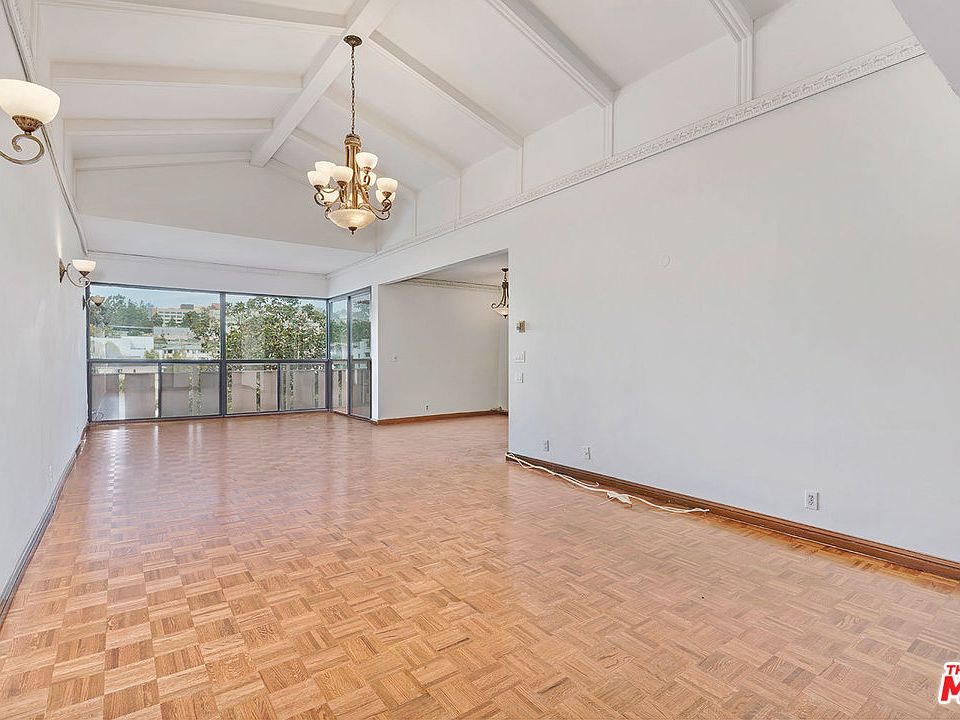 Extremely bright penthouse with spectacular unobstructed 180 north/east views of mountains, treetops and the Getty. Open, airy and extremely private living room with high-pitch beamed ceilings, intricate moldings, wet-bar and floor-to-ceiling windows with access to spacious patio looking out to views. Spacious dining area off living room leads to kitchen with new refrigerator and plenty of cabinet and countertop space. Master suite has double closets and sliding door to patio. Master bathroom features double sinks and separate tub and shower. Second bedroom has large walk-in closet, floor-to-ceiling windows and direct-access to hall bathroom for a possible 2nd en-suite. Unit has newly refinished parquet floors, tons of storage, side-by-side secure garage parking and has been freshly painted. Incredible unit in the heart of Westwood. Annual - $3,995 Per Month