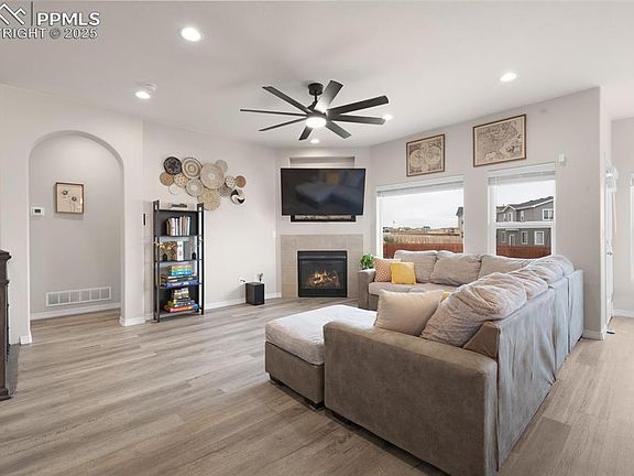 Like new and absolutely stunning, this Meridian Ranch show-stopper is ready for you to move right in. This Craftsman-style ranch home offers all the upgrades, conveniences, and modern touches you could ask for. Fully wired with CAT 6 network cabling, two pre-wires for security cameras, and dual 50-amp circuits in the garage for electric vehicle charging, every detail has been thoughtfully designed for today’s lifestyle. Step inside to a grand open floor plan featuring luxurious vinyl plank flooring, high ceilings, elegant arched entryways, and a cozy corner gas fireplace that adds warmth and charm. The neutral color palette provides a perfect backdrop for any style. The chef’s kitchen is a true highlight with granite countertops, rich espresso cabinetry, stainless steel GE appliances including a gas range, and a spacious center island ideal for casual dining and entertaining. The main-level primary suite is a serene retreat with an incredible 5-piece en-suite bath and a dreamy walk-in closet. Two additional main-level bedrooms plus another in the finished basement offer flexibility for guests, a home office, or hobby space. The expansive basement family room with a wet bar provides the ultimate hangout spot for game nights or movie marathons. Outside, you’ll find a newly installed fence, fresh landscaping, blinds, and ceiling fans—all adding to the home’s appeal and comfort. The attached garage includes electric car charging capability. Enjoy the fantastic Meridian Ranch community with its clubhouse, fitness center, golf course, dog park, neighborhood trails, and an incredible pool with community events year-round. Stylish, smart, and move-in ready—this home combines modern luxury with everyday convenience, creating the perfect place to call home. See Agent/Showing Remarks.