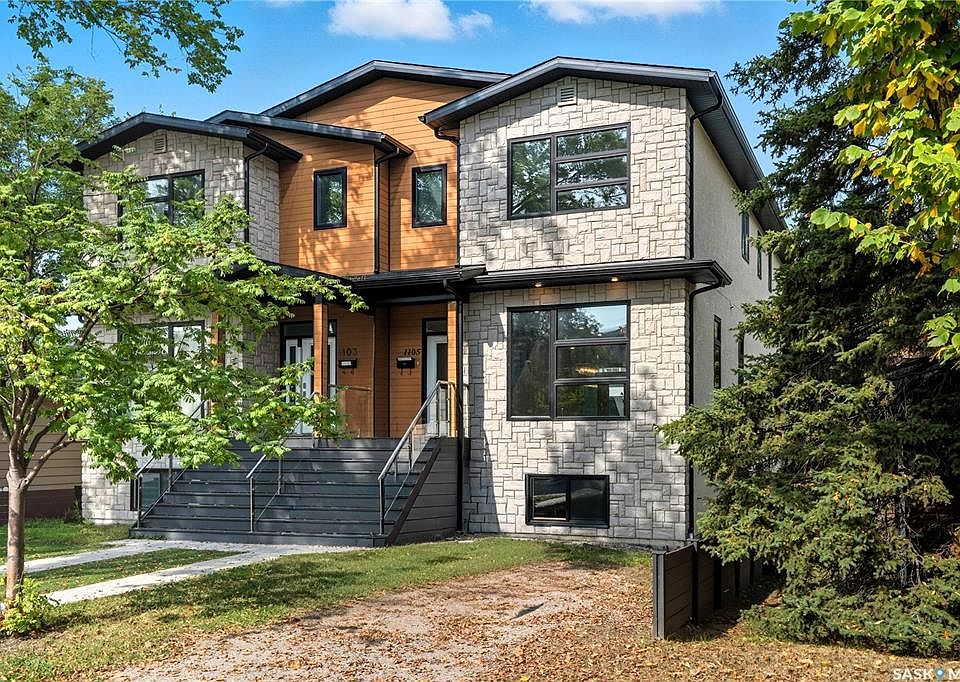 Welcome to 1105 7th Street East, ideally located in the desirable Haultain neighbourhood, just steps from 8th Street shopping, dining, schools, and parks. Built in 2015, this modern 2,050 sq. ft. semi-detached 2-storey home combines the character of a mature area with the peace of mind of a newer build. As you enter, you’ll be impressed by the bright, airy, and open concept main floor, featuring 9’ ceilings, large south-facing windows, and a custom open-tread staircase that create a seamless flow from living to dining to kitchen. The living room includes a stone fireplace, while the gourmet kitchen boasts a massive quartz island, gas range, and modern lighting. A large patio door opens directly to the private composite deck, perfect for indoor-outdoor living. A convenient 2-piece bathroom completes the main floor. Upstairs, the primary suite offers a luxurious walk-in closet with custom shelving and a spa-like ensuite with double sinks, heated floors, and a soaker tub/shower combo. Two additional spacious bedrooms, a 5-piece bath, and a separate laundry room complete the second floor. The basement is open for development, featuring large windows, 9’ ceilings, and a separate side entrance, making it ideal for a potential legal suite for mortgage helper. Outside, enjoy the private composite deck, a double detached garage, plus an extra front parking space for added convenience. The low-maintenance yard is perfect for those who prefer more time relaxing and less time on upkeep.