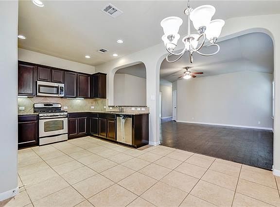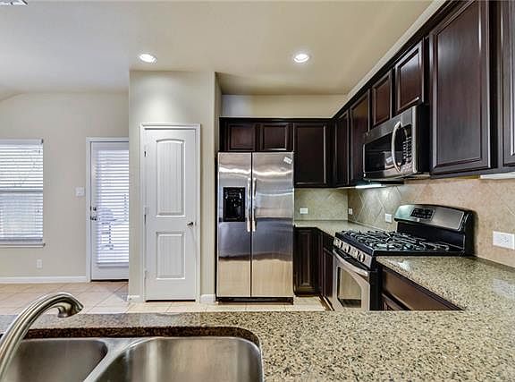 Beautiful 3 bed/2 bath single story home in Teravista. Wood, tile floors in living areas with carpet in bdrms. High ceilings & open floor plan. Spacious Family room for entertaining. Large kitchen boasts granite counters w/tile backsplash, 42â cabinets, ss appliances, breakfast area. Master Suite features a double vanity, garden tub & shower. Full sprinkler system. Close to shopping. Easy commute to Austin.