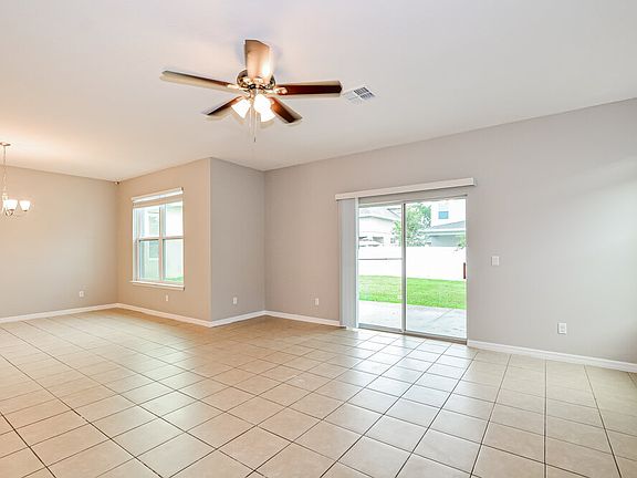 Enjoy taking a look at this renovated Fruitland Park rental home with three bedrooms and two and a half bathrooms. The first level's open floor plan starts in the foyer, where tile flooring adds an attractive touch. The living room's overhead fan promotes comfort. In the kitchen, take note of the large island and pendant lights. Stainless-steel appliances provide efficiency for cooking, and a modern light fixture illuminates the dining room. Easily access the backyard's covered patio through the dining room's sliding glass doors. Upstairs, the main bedroom's large walk-in closet makes choosing an outfit a breeze. The private bathroom includes a walk-in shower and a double-sink vanity with a built-in dressing table. Go on a tour of this home soon!