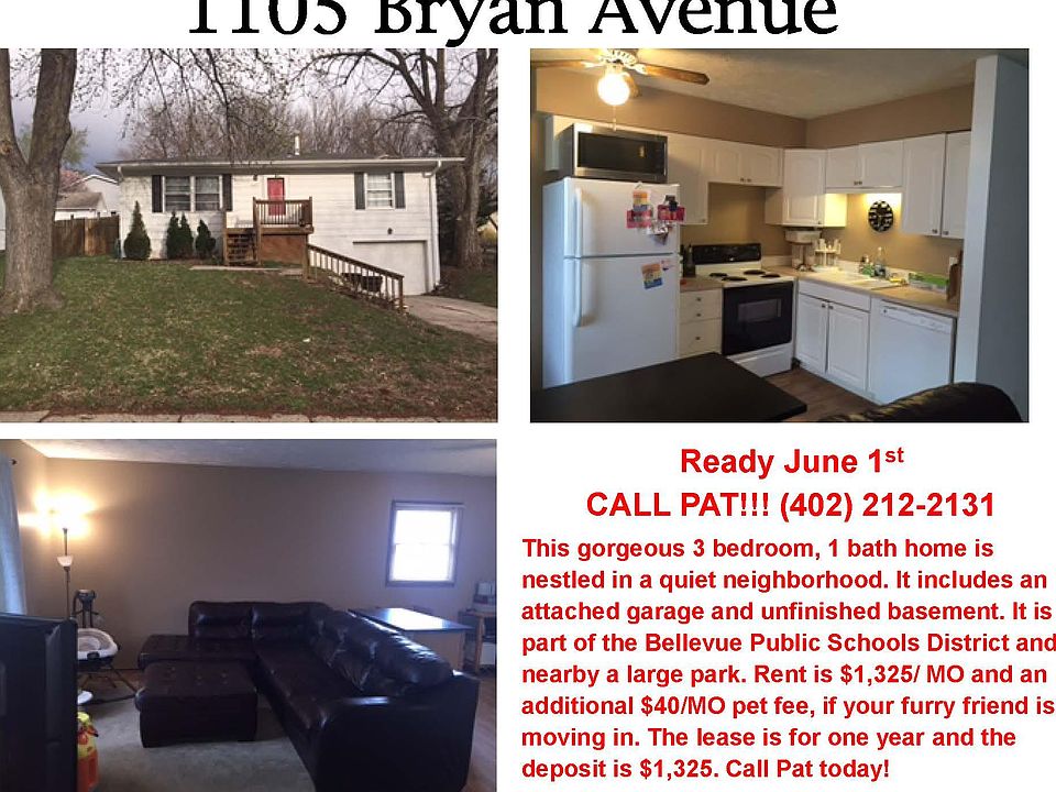 Ready June 1st CALL PAT This gorgeous 3 bedroom, 1 bath home is nestled in a quiet neighborhood. It includes an attached garage and unfinished basement. It is part of the Bellevue Public Schools District and nearby a large park. Rent is $1,325/ MO and an additional $40/MO pet fee, if your furry friend is moving in. The lease is for one year and the deposit is $1,325. Call Pat today!