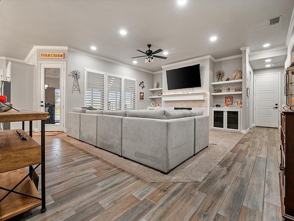 Experience the best of country living in this beautifully custom-built home, offering comfort, style, and all the modern amenities you need. Step into the welcoming living room and cozy up by the fireplace, or gather around the spacious kitchen island—perfect for watching the game or entertaining guests. The open-concept kitchen features sleek stainless steel appliances and a generous walk-in pantry, combining function with farmhouse charm. Tall ceilings, bright spaces, and 2-inch wooden blinds throughout the home create a warm, cohesive modern farmhouse aesthetic. The primary suite is a true retreat, complete with an ensuite bathroom, dual sinks, a garden tub, and a separate shower. A second fireplace anchors the large family room, which is bathed in natural light and opens to a shaded outdoor area overlooking a stunning crystal-clear pool and spa—ideal for relaxing or hosting unforgettable Texas summer gatherings. Outdoors, you'll find a tranquil garden space and a large shop—perfect for hobbies, storage, or creative projects. Inside, the oversized laundry room offers ample storage and space for an extra freezer. This property is the perfect blend of comfort, functionality, and peaceful country charm—ready to welcome you home.